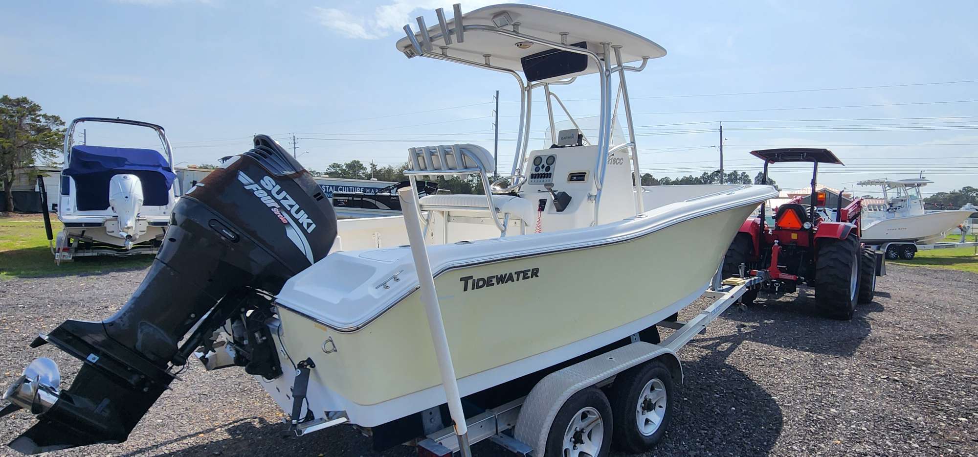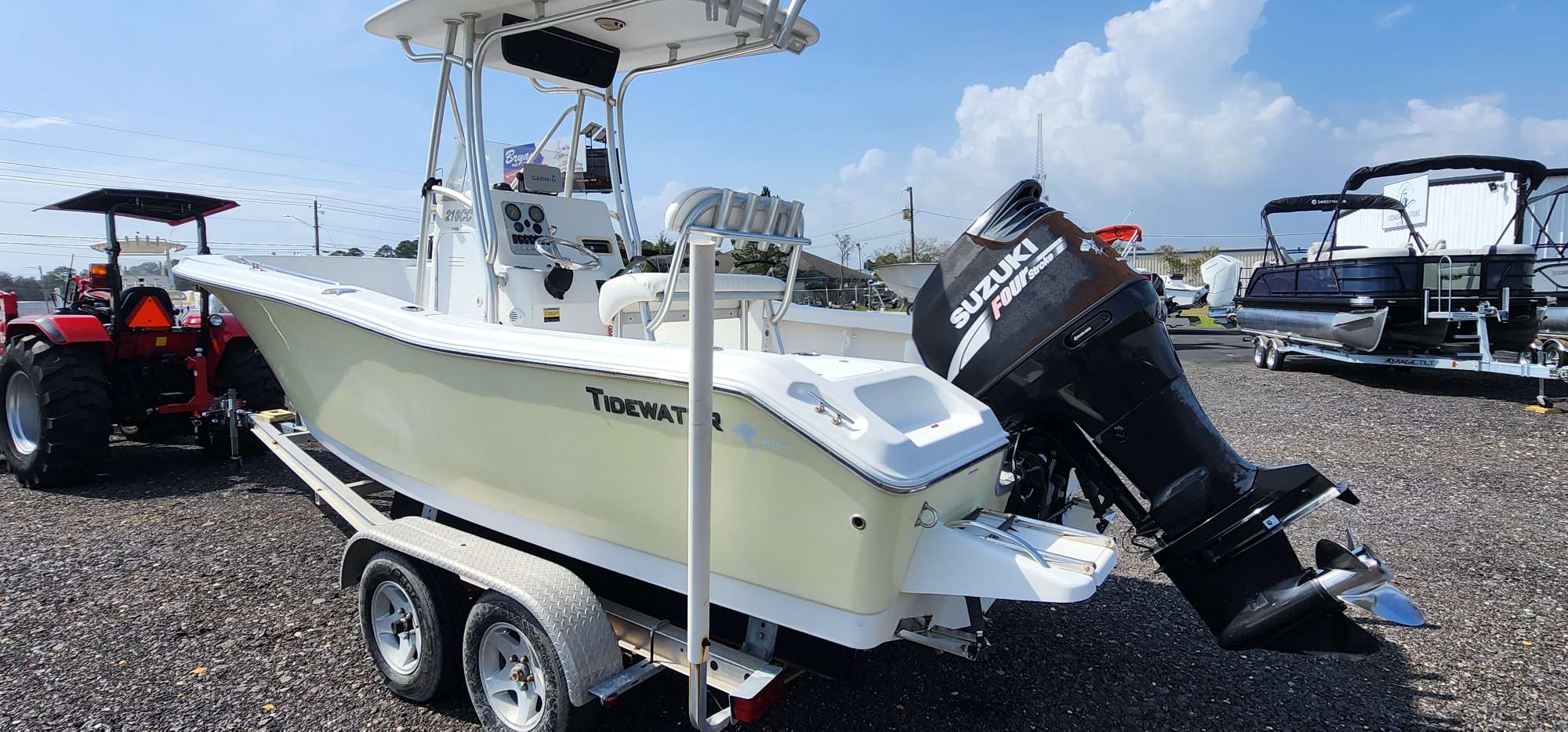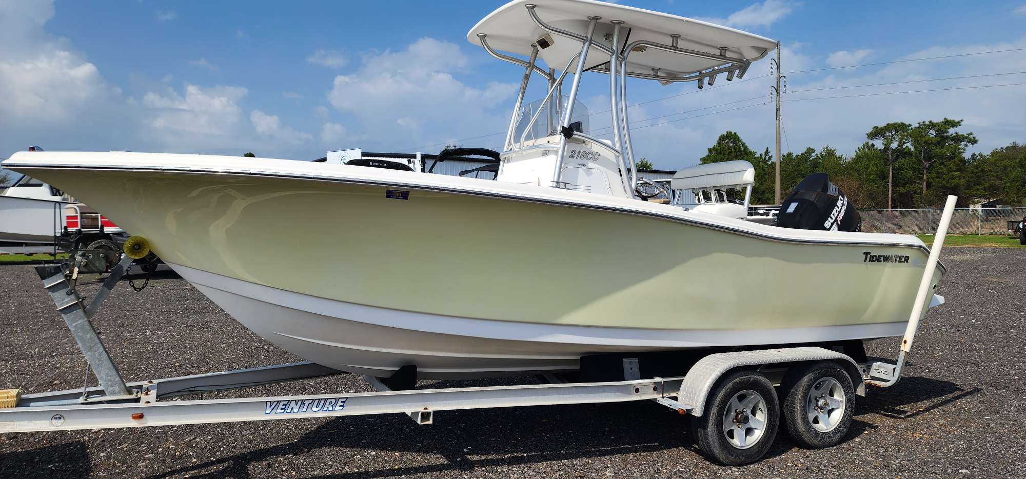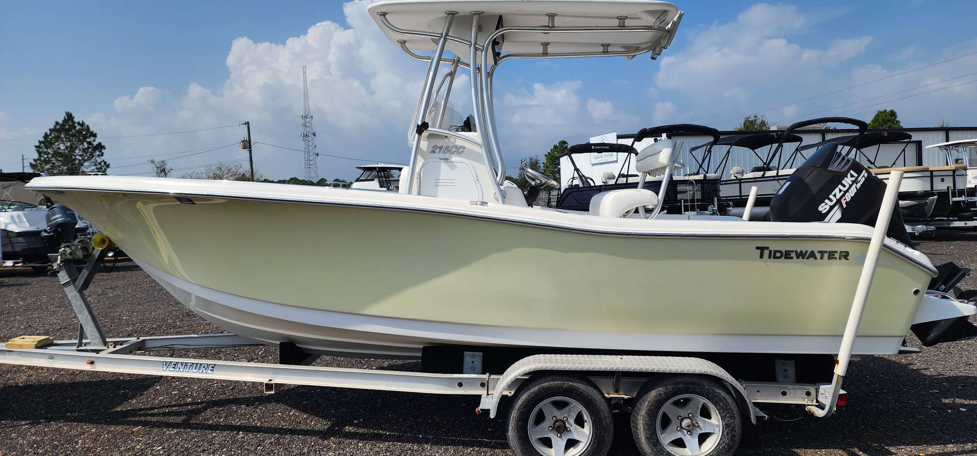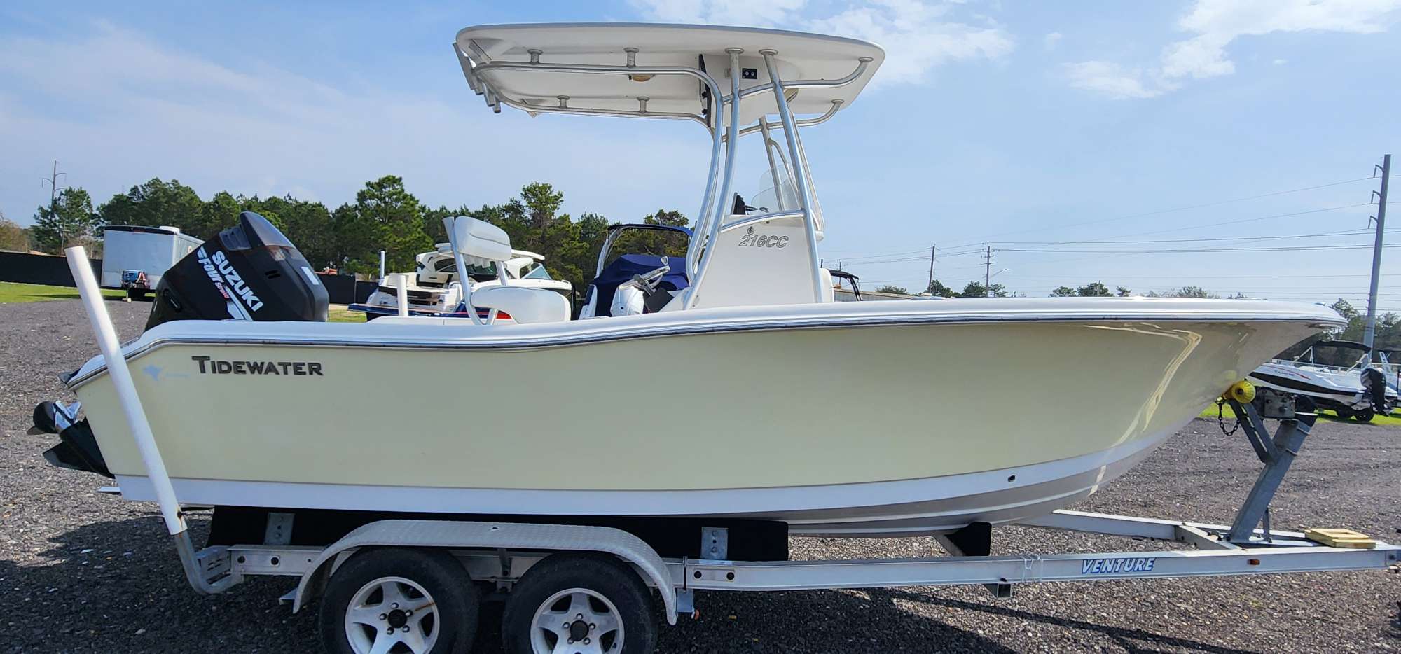 The Tidewater 216 CC Adventure is a 21-foot 6-inch fiberglass center console with an 8-foot 6-inch beam, designed for offshore fishing with Carolina flare for a dry ride. It typically features a 65-gallon fuel tank, a 14-inch draft, 18° or 20° deadrise, and a dry weight of around 2,400 lbs, usually powered by 150-200 hp outboards.